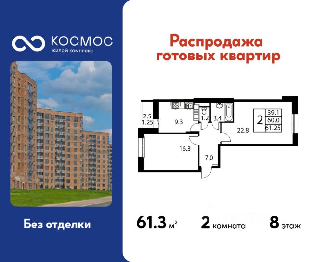 Продаётся 2-комнатная квартира в сданном доме (Корпус 3), срок сдачи: 2-кв. 2025, общей площадью 61.25 кв.м., на 8 этаже. ЖК "Космос" - новое место для жизни, в котором сочетаются отличная экология, удобное расположение, креативные решения архитектуры и функциональные планировки квартир. Строительство жилого комплекса ведётся при проектном финансировании Сбербанка. ЖК "Космос" расположен в микрорайоне Авиационный (Домодедово), в 24 километрах от МКАД по Каширскому шоссе. Проект будет состоять из 7 корпусов высотой 12 этажей. На первых этажах домов запланировано открытие необходимых для жителей объектов торговой и социальной инфраструктуры, в том числе магазинов, кафе, медицинского центра. В микрорайоне Авиационный также есть всё необходимое для комфортной жизни - здесь находятся детские сады, школы, высшие учебные заведения, магазины, поликлиники и медицинские центры, спортивный клуб, ТЦ "Торговый город". Помимо этого, жители ЖК "Космос" смогут пользоваться развитой инфраструктурой г.о. Домодедово - до него можно добраться за 20 минут на автомобиле или электричке. Одна из особенностей ЖК "Космос" - отличное экологическое состояние локации. В 10 минутах ходьбы от комплекса находится благоустроенный парк "Взлёт" с красивым прудом Лесным, здесь планируется дальнейшее благоустройство территории. Рядом с "Космосом", на площади Гагарина, будут проходить городские мероприятия. Проект отличается удобной транспортной доступностью - до МКАД можно добраться за 20-25 минут. Около жилого комплекса находятся остановки общественного транспорта, в пешей доступности - ж/д станция "Авиационная" Павелецкого направления. На придомовой территории ЖК "Космос" предусмотрено устройство парковочных мест численностью 544 машино-места, в том числе для маломобильных групп населения.