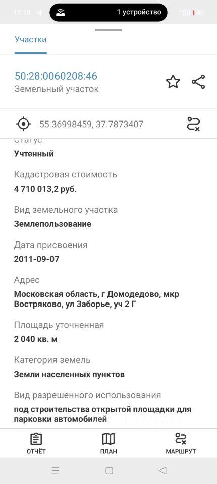 Сдаётся участок в аренду на долгий срок. Первая линия от Каширского шоссе. Площадь участка 20,4 сот. Адрес: г. Домодедово, мкр. Востряково, ул. Заборье, уч. 2 Г. Категория земель: земли населённых пунктов; вид разрешенного использования: под строительства открытой площадки для парковки автомобилей. Полностью огорожен по периметру забором высотой 2 м. Имеются въездные ворота, будка для КПП и шлагбаум, установлено освещение вдоль забора по периметру. Участок полностью асфальтирован. Удобный подъезд к участку.