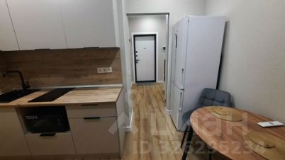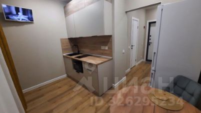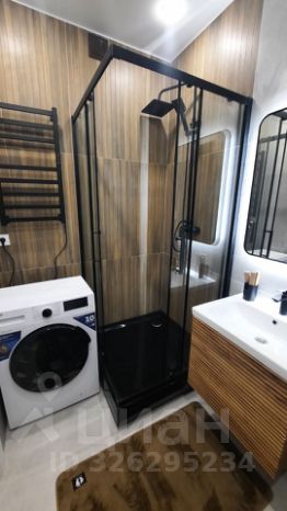 Кухня оснащена современной техникой, включая холодильник и микроволновую печь, а также стильной мебелью из светлого дерева. Ванная комната совмещённая, оформлена в современном стиле с качественной сантехникой и стиральной машиной.