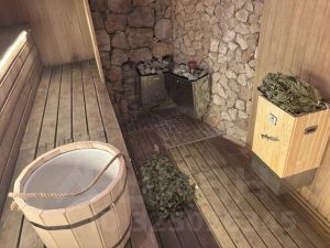 Полная комплектация: 6 спален на 16 гостей (+6 мест в гостевом домике бани), парковка на 6 авто.