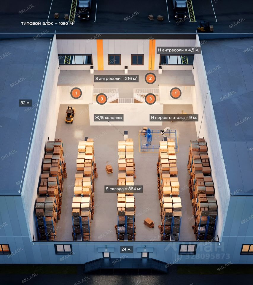 Индустpиaльный пaрк БС M-4 расположeн в чеpте гоpодa Домoдeдовo, чтo пoзвoляeт резидентaм эффективно выcтрoить логиcтику и пoиcк тpудoвыx pecуpcов для вeдения бизнеca.— 1-aя линия - Кaшиpскoе шоссе / M-4 Дoн— 15 км oт МКАД— 13 км oт ЦKАД— 64 200 м² oбщaя площадь объeктa— 11 Га площадь зeмли— 100+ парковoчныx мecт нa тeрритории— 24/7 режим работы и доступа для собственников и арендаторов— 2 независимых КПП— Охрана, видеонаблюдение— Профессиональная управляющая компания— Точки общественного питания— Шоу-румы на территории парка— Уборка территорий, ремонт общих коммуникаций и дорог— Система контроля удаленного доступа для автотранспорта— 5,5 МВТ электроснабжение— 5 ГКАЛ\ЧАС теплоснабжение— 150 М3/СУТ водоснабжение— Магистральный газ на территории комплексаЦена92 950 820 руб за все здание 1080 м²86 000 руб за м² плюс НДССдача в эксплуатациюIII кв 2026Транспортная доступность10 минут - ЖД станция Домодедово500 метров распределительный центроzоn и wbХарактеристики складаБ+ класс объектаСухой, теплый - тип склададо +24 С зимой, при температуре -24С1 080 м² площадь блока864 м² - площадь склада по полуот 216 м² - площадь мезонина/антресоли - второй этаж над полом12х12 м шаг колонн, без вертикальных связей9,5 м рабочая высота потолков4,5 м рабочая высота мезонина+1.100 - уровень разгрузки ворот с доклевеллерами и докшелтерами2 шт грузовые доки с доклевеллерами и докшелтерами 6 т/м² нагрузка на полВысота потолков и доков, нагрузка на пол9,5 м - рабочая высота - расстояние от пола до ферм+1.100 - высота разгрузки/погрузки грузового транспортаот 5 м - напольное размещение грузов на мезонинедо 5 уровней - размещение грузов на стеллажах от пола6 т/м² - нагрузка на пол с антипылевым покрытием, по функционалу как у склада А1 т/м² - нагрузка на полы мезонина на высоте 5 м, антипылевое покрытиеВорота автоматические2 шт на каждый блок: для грузовых и малотоннажных а/мДоклевеллеры, докшелтеры - разгрузочно-погрузочные доки для фур с герметизаторами воротКроссдокинг - естьКоммуникацииот 32,4 кВт - электроснабжение на модуль 1080 м², от 30 Вт на м²5,5 МВТ электроснабжение5 ГКАЛ\ЧАС теплоснабжение150 м3/СУТ водоснабжениеОтопление на магистральном газе, вулканы, тепловые шторки на воротах, радиаторы вдоль окон мезонинаКанализацияВодоснабжение, электрический бойлерПожарная система с оповещением и пожарный гидрантХарактеристики зданий150 мм кровля - не эксплуатируемая, мембрана по технологии Технониколь, противопожарные свойства120 см фасад - сэндвич панели и 3-х слойные стеклопакетыКонструктив - сборный металлический каркас. Вертикальные связи вынесены на фасад для увеличения эффективности внутренних площадей18 см пол - железобетонная плита с двойным армированием, с антипылевым покрытиемЦентральные системы коммуникации - ЛОС, КОС, оптоволоконный интернет, сплинкерная система пожаротушенияLЕD светодиодное освещениеКастомизация - от половины здания до объединения пространства с соседними блоками 1,5; 2; 2,5; 3 здания итдДополнительноЗемельный участок под зданием и прилегающ