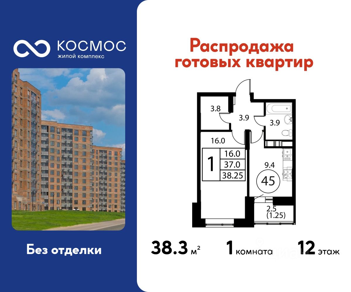 Продаётся 1-комнатная квартира в сданном доме (Корпус 1), срок сдачи: 2-кв. 2025, общей площадью 38.25 кв.м., на 12 этаже.