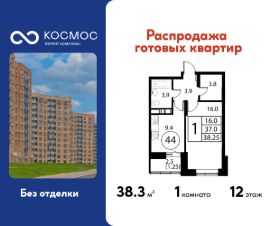 Продаётся 1-комнатная квартира в сданном доме (Корпус 1), срок сдачи: 2-кв. 2025, общей площадью 38.25 кв.м., на 12 этаже.