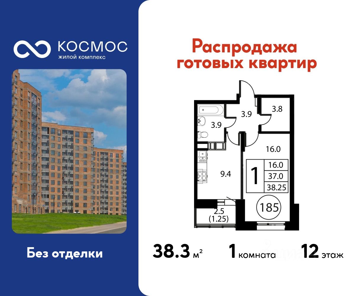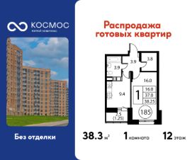 Продаётся 1-комнатная квартира в сданном доме (Корпус 2), срок сдачи: 2-кв. 2025, общей площадью 38.25 кв.м., на 12 этаже.