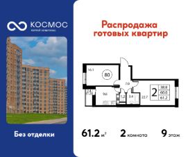Продаётся 2-комнатная квартира в сданном доме (Корпус 2), срок сдачи: 2-кв. 2025, общей площадью 61.20 кв.м., на 9 этаже.