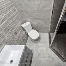 В каждом санузле есть сток и гидроизоляция. Можно не волноваться о пролитой на пол воде.