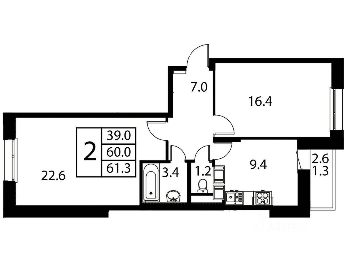 Продаётся 2-комнатная квартира в сданном доме (Корпус 7), срок сдачи: 2-кв. 2025, общей площадью 61.30 кв.м., на 12 этаже.