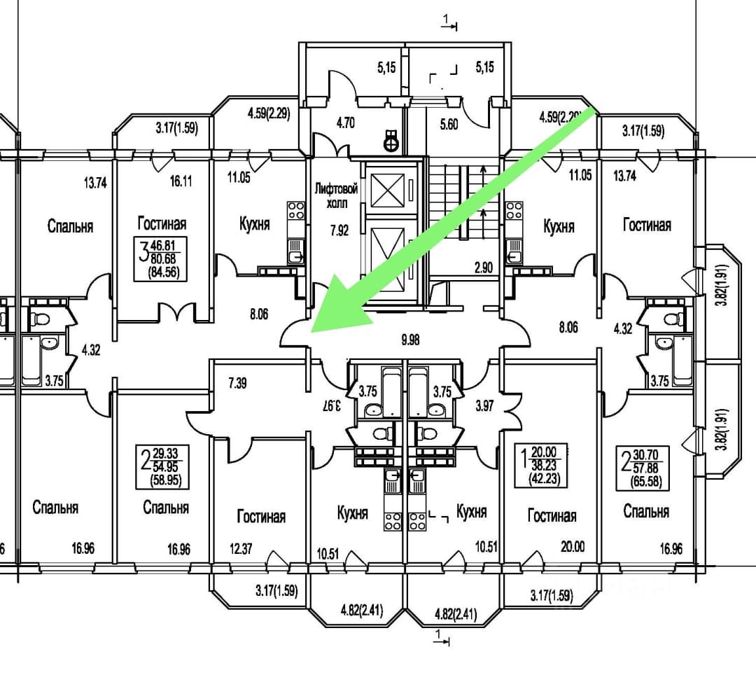 Просторная квартира 84,56 (88,56) м2. Особенность квартиры: выход окон на две стороны света Север и Юг, вид из окон во двор, холл 8 м2, комнаты 16,11+13,74+16,96 м2, кухня 11 м2, ванная комната и отдельный с/у, две лоджии 3,17 и 4,59 м2.