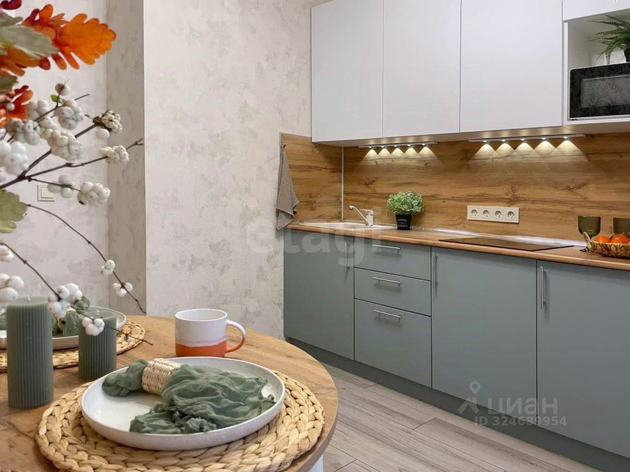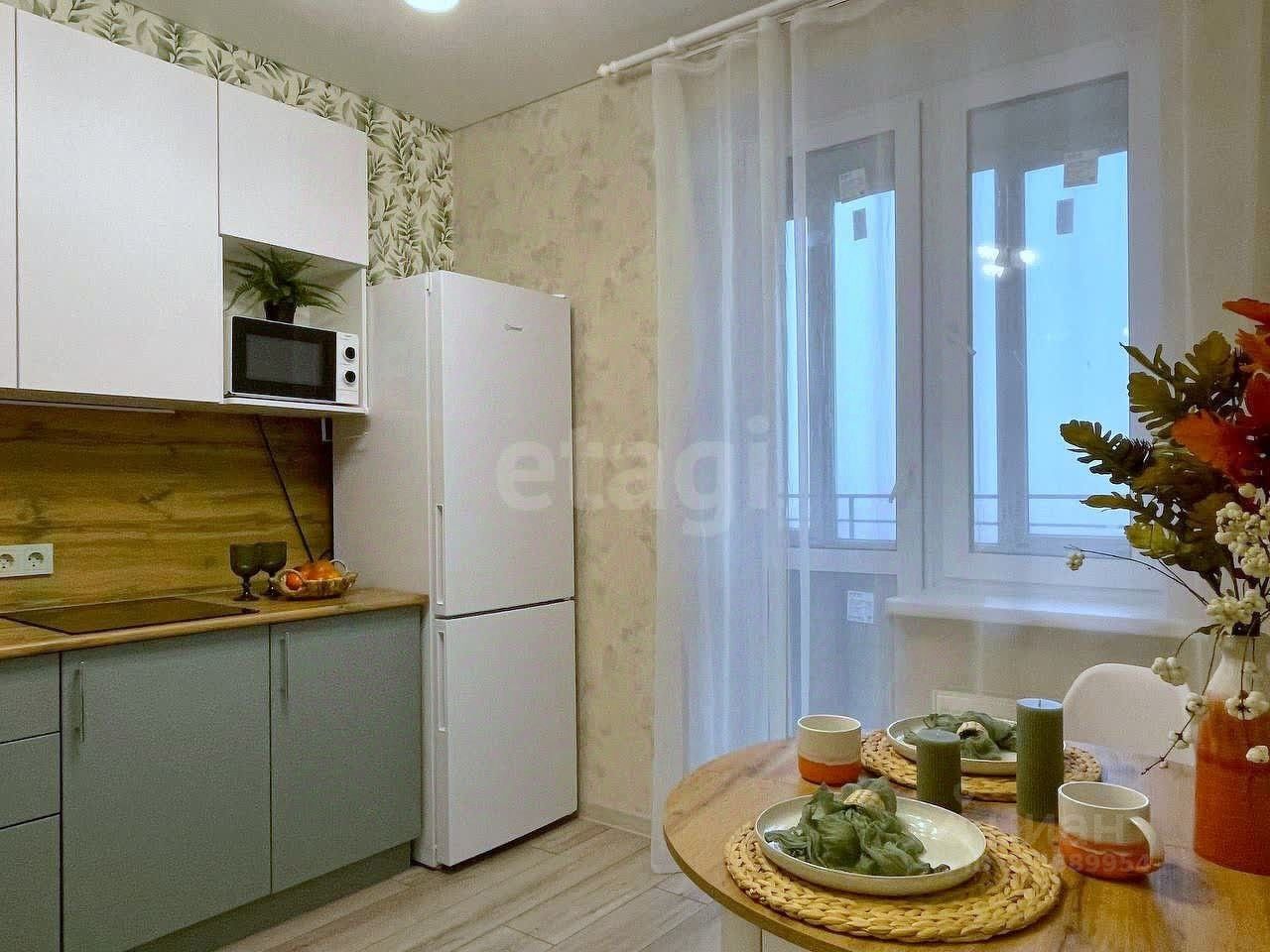 Уютная кухня с гарнитуром, техникой и выходом на застекленный балкон — место для утреннего кофе.