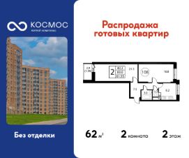 Продаётся 2-комнатная квартира в сданном доме (Корпус 7), срок сдачи: 2-кв. 2025, общей площадью 61.95 кв.м., на 2 этаже.