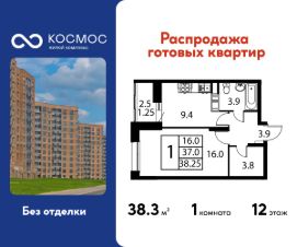 Продаётся 1-комнатная квартира в сданном доме (Корпус 7), срок сдачи: 2-кв. 2025, общей площадью 38.25 кв.м., на 12 этаже.
