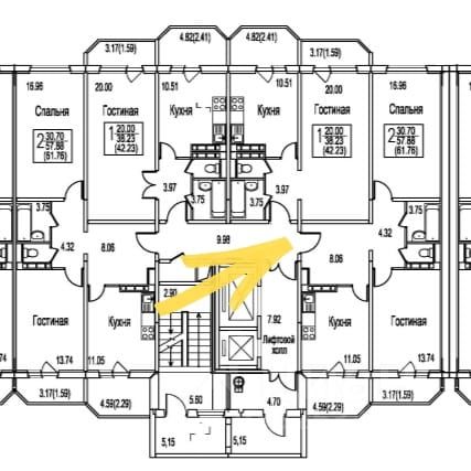 Просторная квартира 61,76 (65,64) м2. Особенность квартиры: выход окон на две стороны света Запад и Восток, панорамные виды из окон, холл 8 м2, комнаты 16,96+13,74 м2, кухня 11 м2, ванная комната и отдельный с/у, две лоджии 3,17 и 4,59 м2.