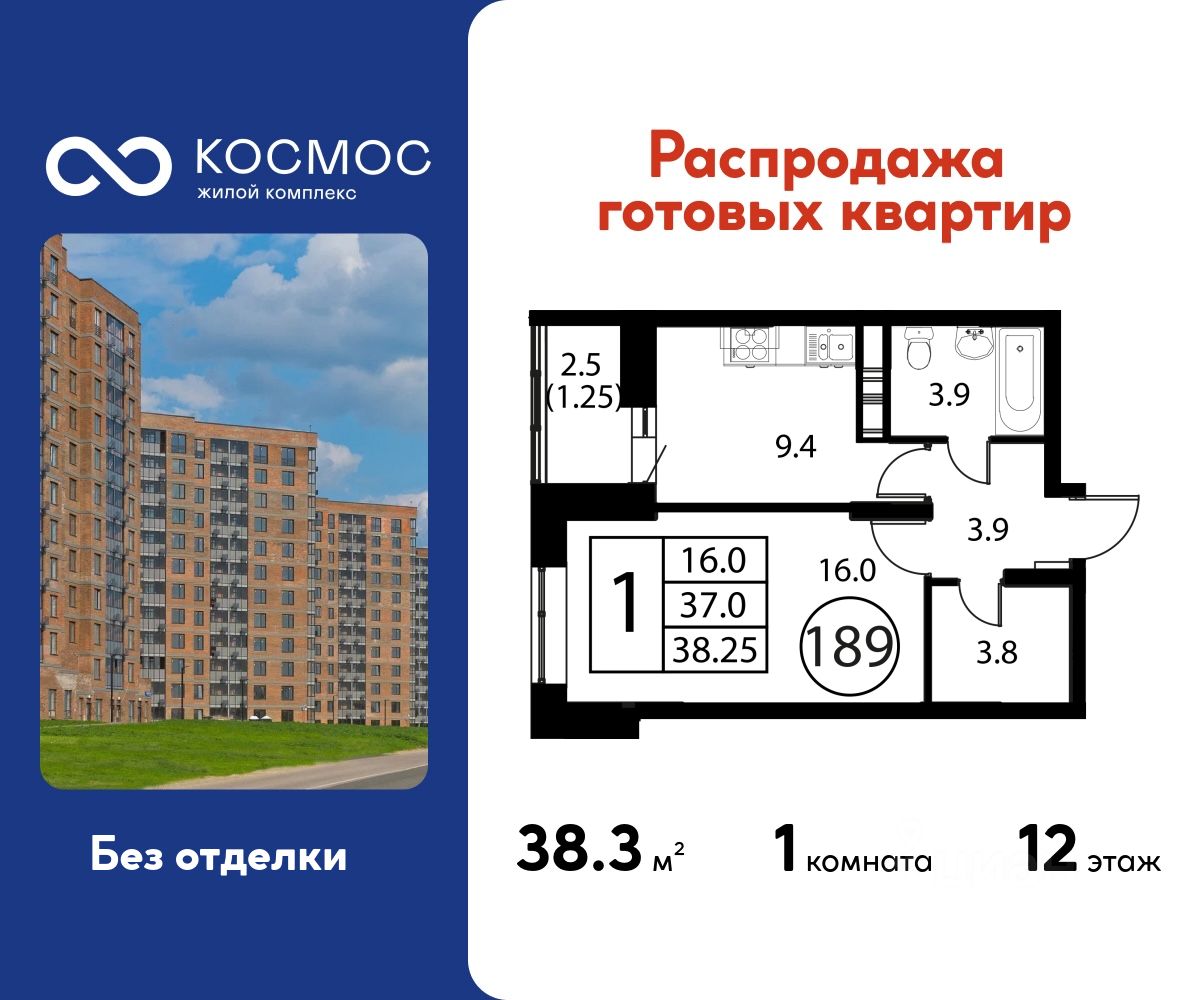 Продаётся 1-комнатная квартира в сданном доме (Корпус 2), срок сдачи: 2-кв. 2025, общей площадью 38.25 кв.м., на 12 этаже.