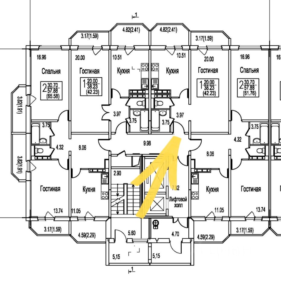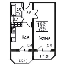 Просторная квартира 42,23 (46,23) м2. Особенность квартиры: выход окон на Запад, панорамный вид из окон на лес, прихожая 4 м2, комната 20 м2, кухня 10,5 м2, ванная комната и отдельный с/у, две лоджии 3,17 и 4,82 м2.