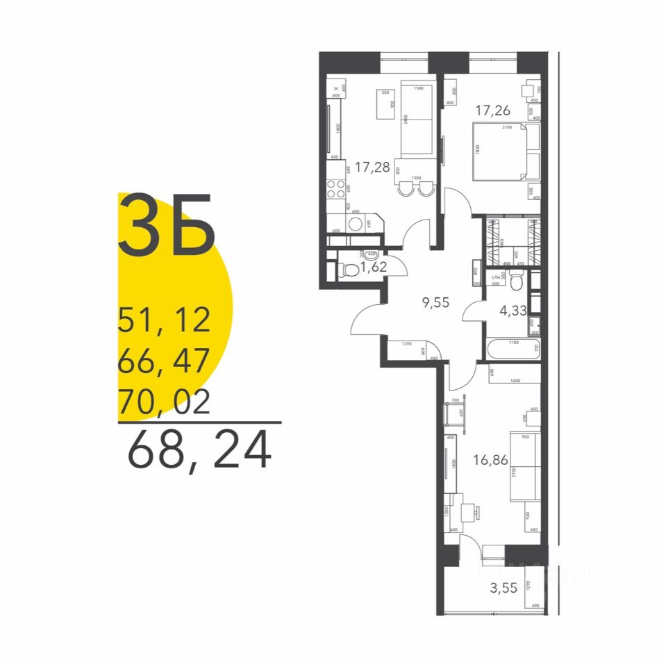 Монолитно-кирпичный дом комфорт-класса. Просторная квартира 68,24 (70,02) м2. Особенность квартиры: выход окон на две стороны света Восток и Запад, панорамные виды из окон во двор и на лес, холл 9,5 м2, комнаты 17,2+17,2 м2, кухня-гостиная 17 м2, удобная гардеробная комната 4 м2, ванная комната 4,3 м2, гостевой с/у, лоджия 3,5 м2.