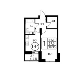Продаётся 1-комнатная квартира в сданном доме (Корпус 1), срок сдачи: 2-кв. 2025, общей площадью 38.35 кв.м., на 12 этаже.