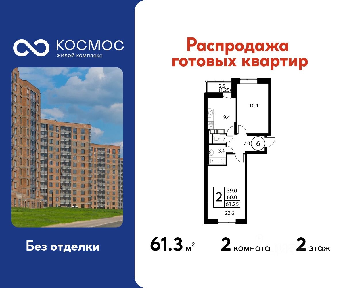 Продаётся 2-комнатная квартира в сданном доме (Корпус 1), срок сдачи: 2-кв. 2025, общей площадью 61.25 кв.м., на 2 этаже.