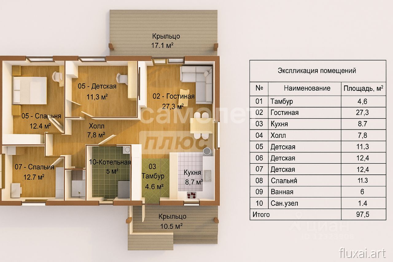В энергоэффективном доме выполнена чистовая отделка под ключ. Просторная светлая кухня-гостиная с прямым доступом на террасу — идеальное пространство для семейных ужинов и дружеских встреч. Три комфортные спальни обеспечивают каждому члену семьи личное пространство и возможность отдохнуть вдали от суеты. Два оборудованных санузла из керамогранита гарантируют комфорт и удобство всех обитателей дома. Парковочное место на два автомобиля обеспечивает порядок и безопасность вашего транспорта. Модульная кухонная мебель предоставляется абсолютно бесплатно в подарок новым владельцам!