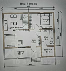 1 этаж: терраса, холл, кухня-гостиная, спальня, санузел, топочная.