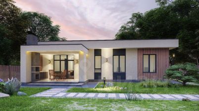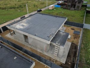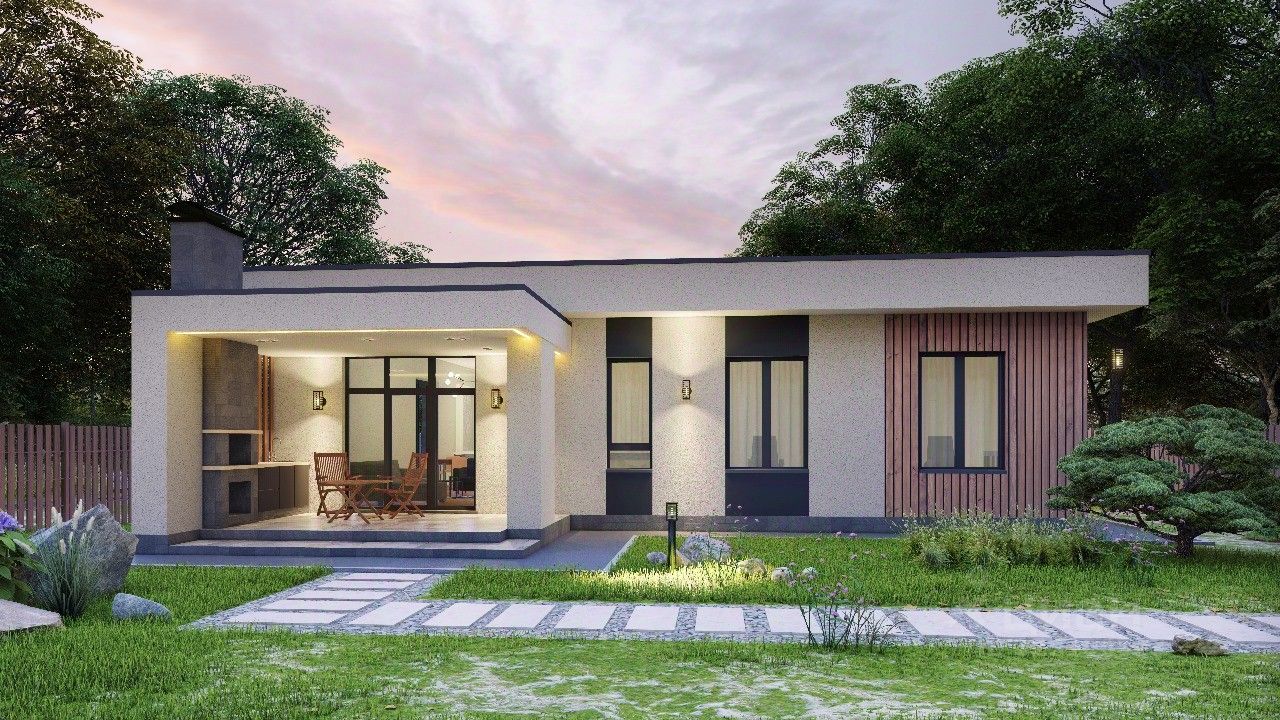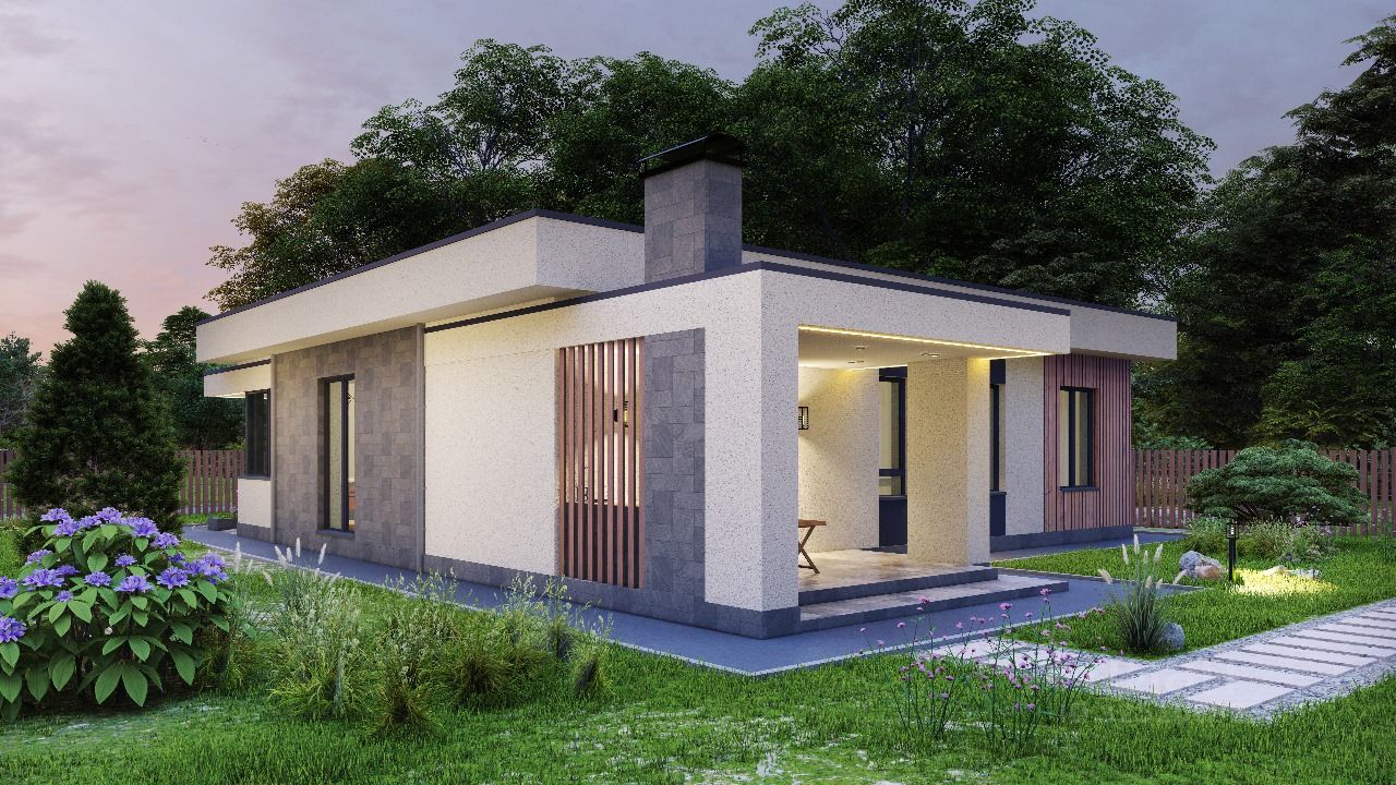 Стильная архитектура с плоской кровлей и лаконичными фасадами выделяет дом в посёлке и подойдёт тем, кто любит современный минимализм.