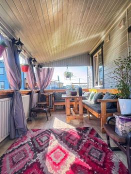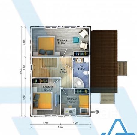 На первом этаже расположена просторная терраса площадью 15 кв. м, компактная кухня-гостиная 16 кв. м, уютная комната 10 кв. м, холл, санузел и техническое помещение; на втором этаже — три светлые комнаты 7,10 и 16 кв. м и второй санузел.