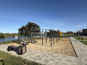 В поселке есть электричество, 15кВт, газ , асфальтированная дорога, озеленение поселка и благоустройство, спортивная и детская площадки, по периметру участка сделан каркас забора.