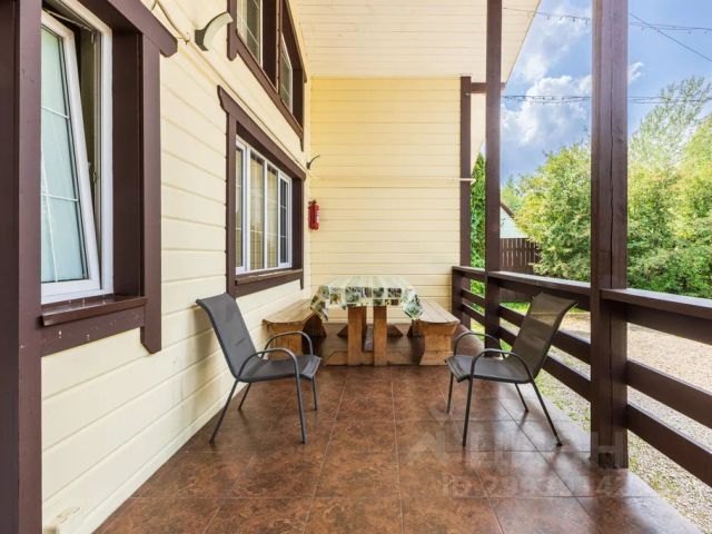 На крытой террасе располагается стол со стульями и беседка с диваном, где можно уютно расположиться в теплое время или ненастье.